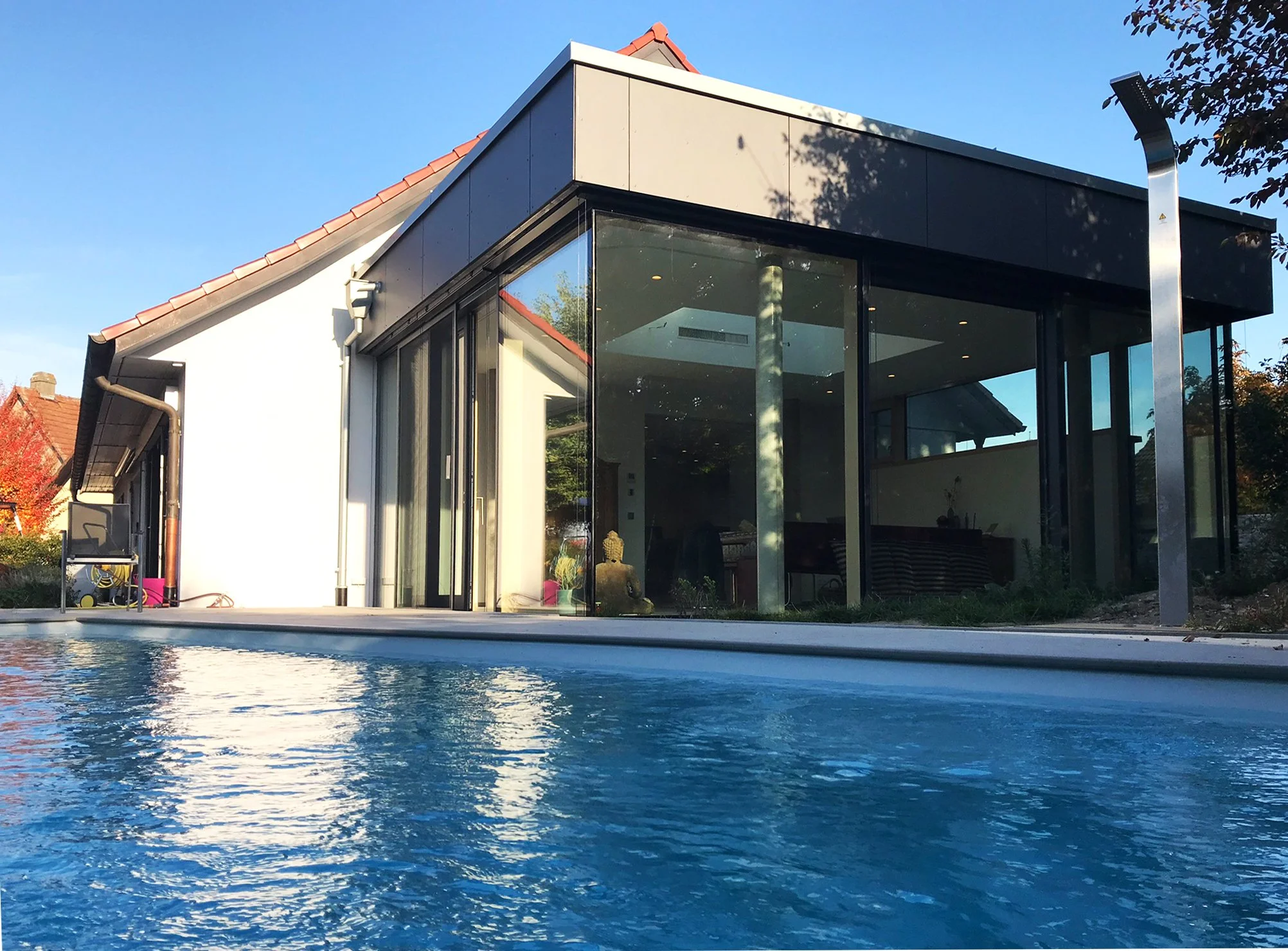 Entwurflich abgerundet wird dieser Bereich durch ein eingelassenes Aussenschwimmbadbecken. Somit gelang es, durch wenige zurückhaltende Eingriffe den Gartenbereich freundlich und nutzbar zu gestalten.