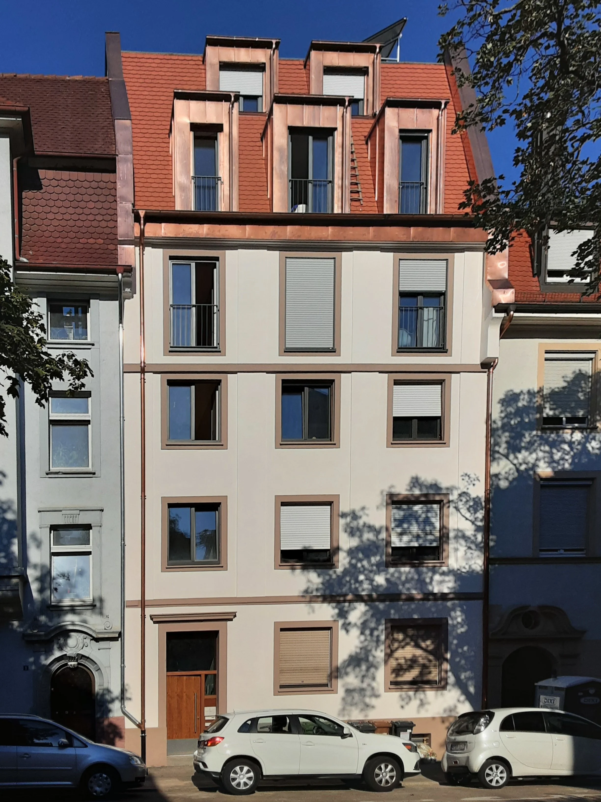 Die vormals niedere Traufkante wurde auf die annähernd durchgehende Traufhöhe des Straßenbildes angehoben und durch eine neue Steildachkonstruktion auf die Firsthöhe der umgebenden Gebäude gesetzt. Die Gesamtabwicklung der aneinander gereihte Straßenfassaden erfährt dadurch ein harmonischeres Erscheinungsbild. Kleine und zierliche Gaubenaufbauten, welche sich im oberen Dachgeschoss zusätzlich noch zahlenmäßig verringern führen zu einer feingliedrigen Gesamtgestaltung, die durch eine zusätzliche farbliche Akzentuierung der alten Putzerhebungen in der Wahrnehmung der räumlichen Tiefe verstärkt wird. Gartenhofseitig werden die Wohnbereiche der Vollgeschosse durch großzügige Balkonanlagen in den Außenbereich ausgedehnt, während das von einer zu anderen Seite durchgehende zweite Dachgeschoss durch eine Dachloggia vervollständigt wird.